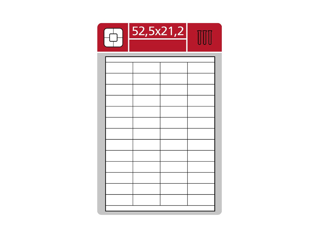 Bílé etikety na arších A4 určené pro kopírování nebo potisk v laserových a inkoustových tiskárnách. Jsou vyrobeny násekem horní samolepicí vrstvy se silně lepivým akrylátovým lepidlem na vodní bázi.
