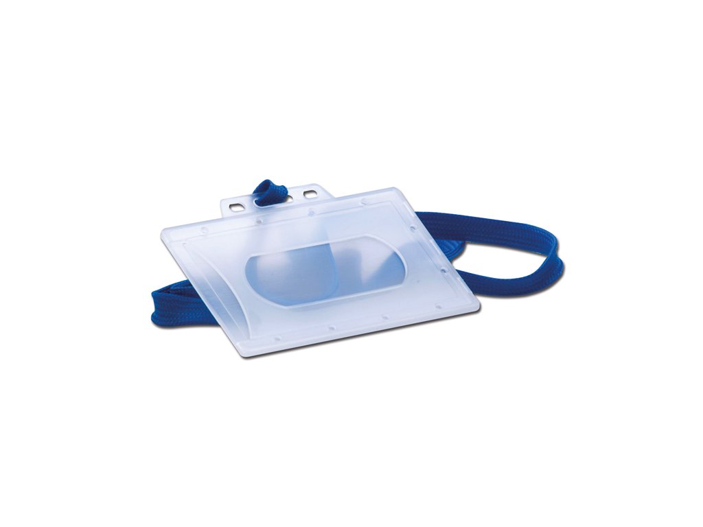 Tuhá plastová visačka pro kreditní karty rozměru 54×86 mm s modrou sňůrkou na krk. Jedna stranas oválným otvorem pro snadné vsunutí karty.