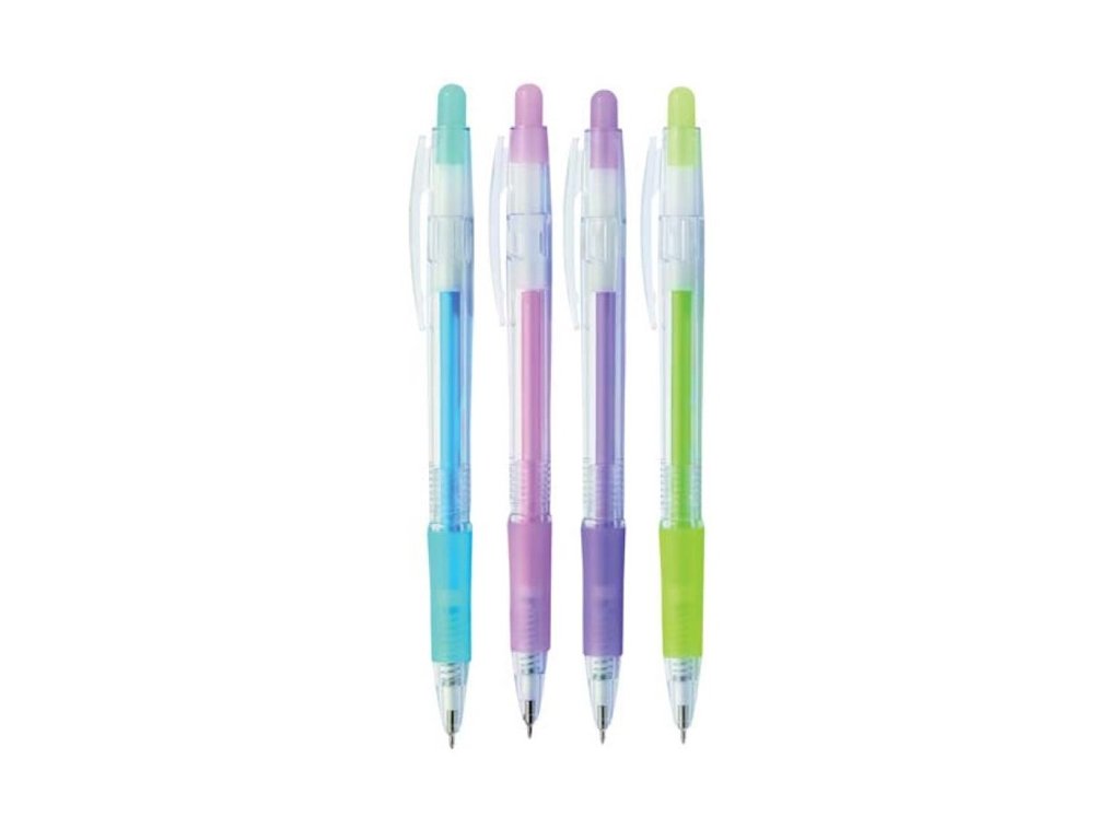 Celoplastové transparentní kuličkové pero s pogumovaným úchopem. Siskátko a úchopová zóna v pastelových barvách. Mix barev.- náplň modráCena za 1 kus. Originál balení 25 ks.